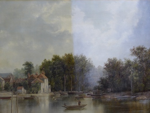 Cleaning a painting involves the removal of dirt and airborne deposits (fly droppings being very common) that have built up over time on the surface of the work of art, this may include discoloured varnish which could be in multiple layers or indeed no varnish at all. Discoloured varnish is rather like looking at a painting whilst wearing dark glasses.